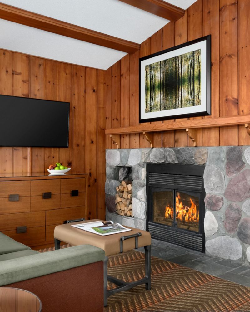 These suites feature two double beds and a cozy wood-burning fireplace in a separate sitting area, with a door providing privacy from the bedroom. The bathroom is conveniently located within the bedroom area. Perfect for families or couples seeking both comfort and separation.