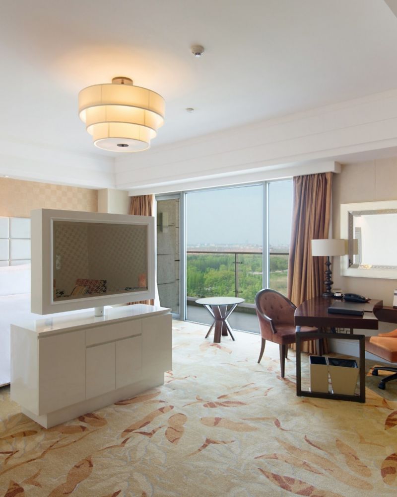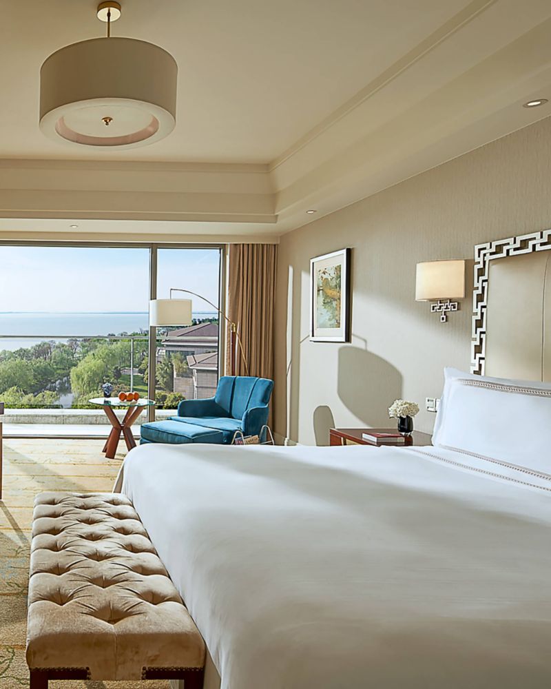 The room has idyllic Yangcheng Lake views and a breath-taking sunset panorama. Most rooms are equipped with a private balcony, floor-to-ceiling windows, a Sealy mattress, and a bathtub.