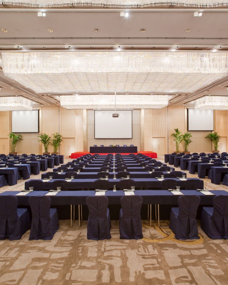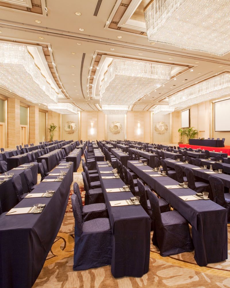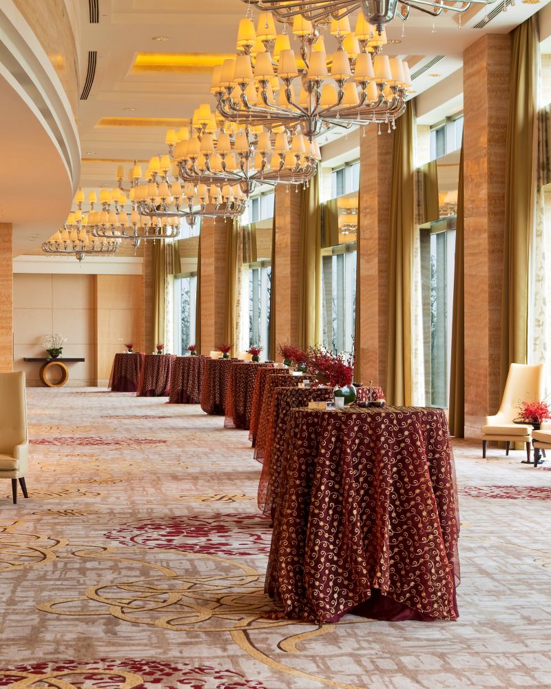 Our Grand Ballroom Kun Yun Hall is a generous 1,132 square metres with 6.8 meters ceiling height. It can accommodate up to 1,000 guests banquet, also can be easily divided into three sections. A lavish 550-square-metre ballroom foyer, with a commanding view of Yangcheng Lake.