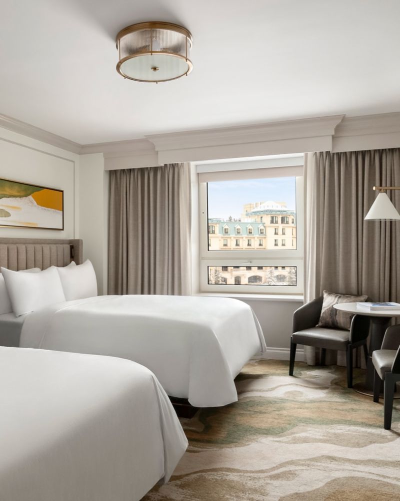 Larger Guest Room with 2 Queen Beds Featuring Spectacular Views of Lake Louise & Victoria Glacier. Ideal Accommodation for a Couple or Family. 370 ft² / 34 m².