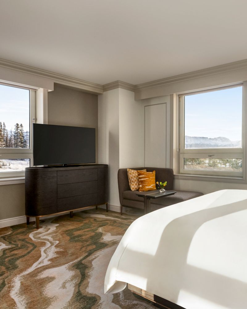 Private Lounge with Concierge Services Offering Breakfast & Canapes. Guest Room with 1 King Bed. View of Whitehorn Mountain or Bow Valley. 230 ft² / 21 m².