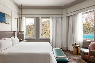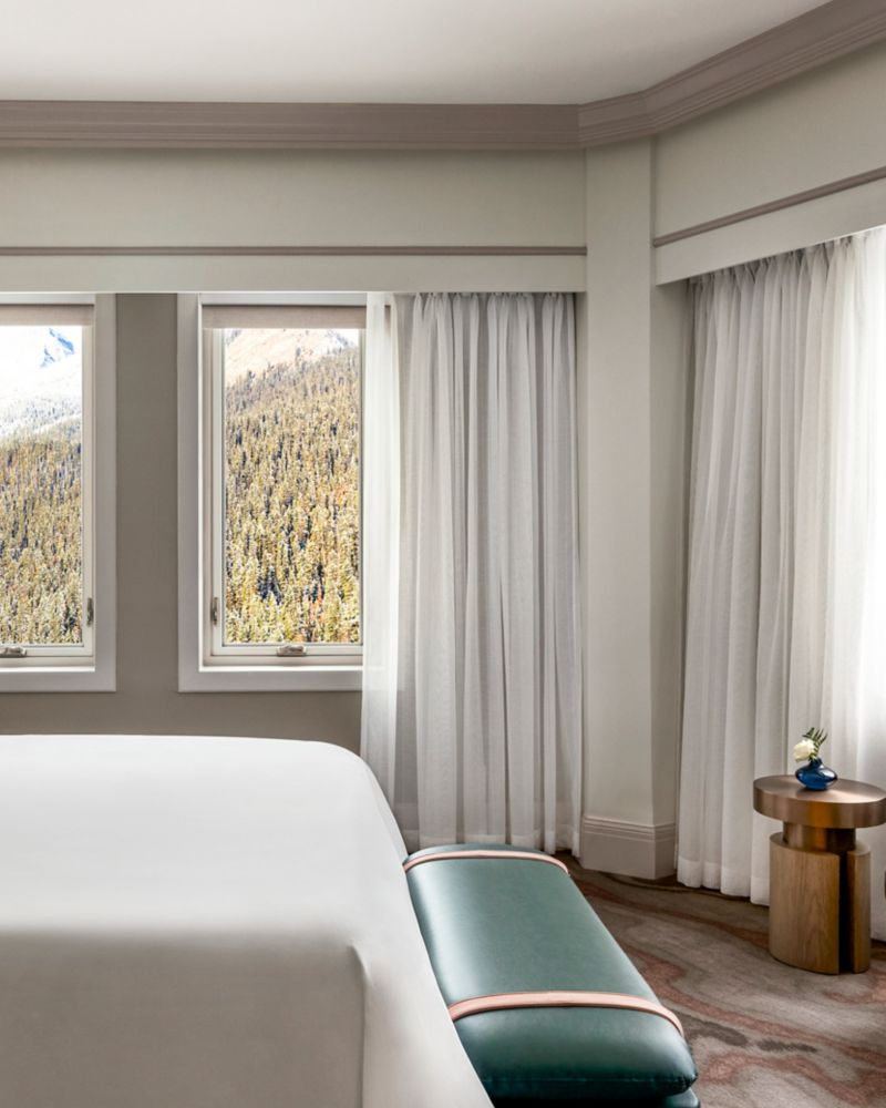 Larger Guest Room with 1 King Bed Featuring Spectacular Views of Lake Louise & Victoria Glacier. Ideal Accommodation for an Individual or Couple. 370 ft² / 34 m².
