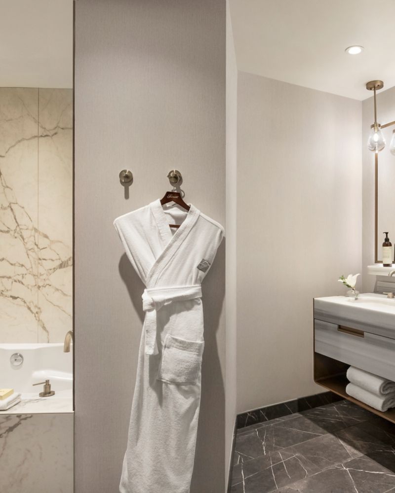 Split Level Signature Suite with Terrace Offering Sweeping Views of Whitehorn Mountain & Bow Valley. Access to Fairmont Gold Amenities. 1 King Bed, 2 Bathrooms. 630 ft² / 58 m².