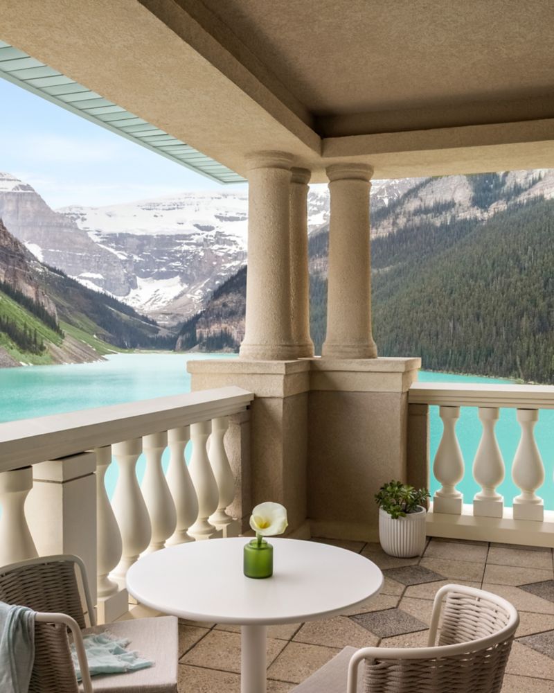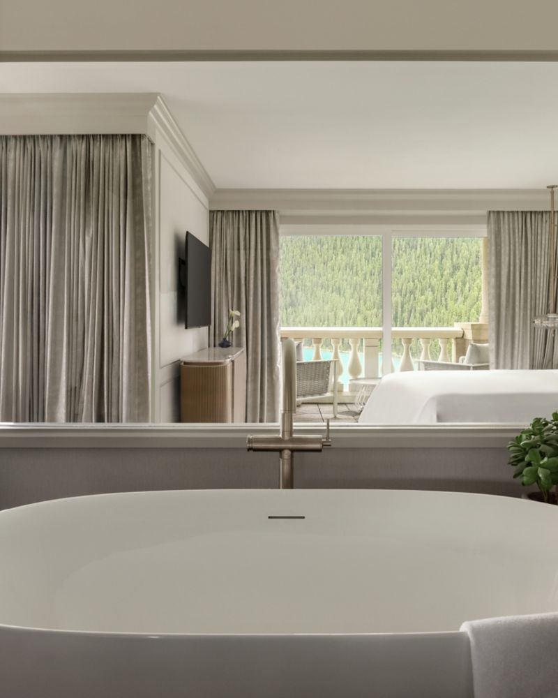 Signature Suite with Majestic Views of Lake Louise & Victoria Glacier. Spacious Living Room. Access to Fairmont Gold Amenities. 1 King Bed, 2 Bathrooms. 850 ft² / 79 m².