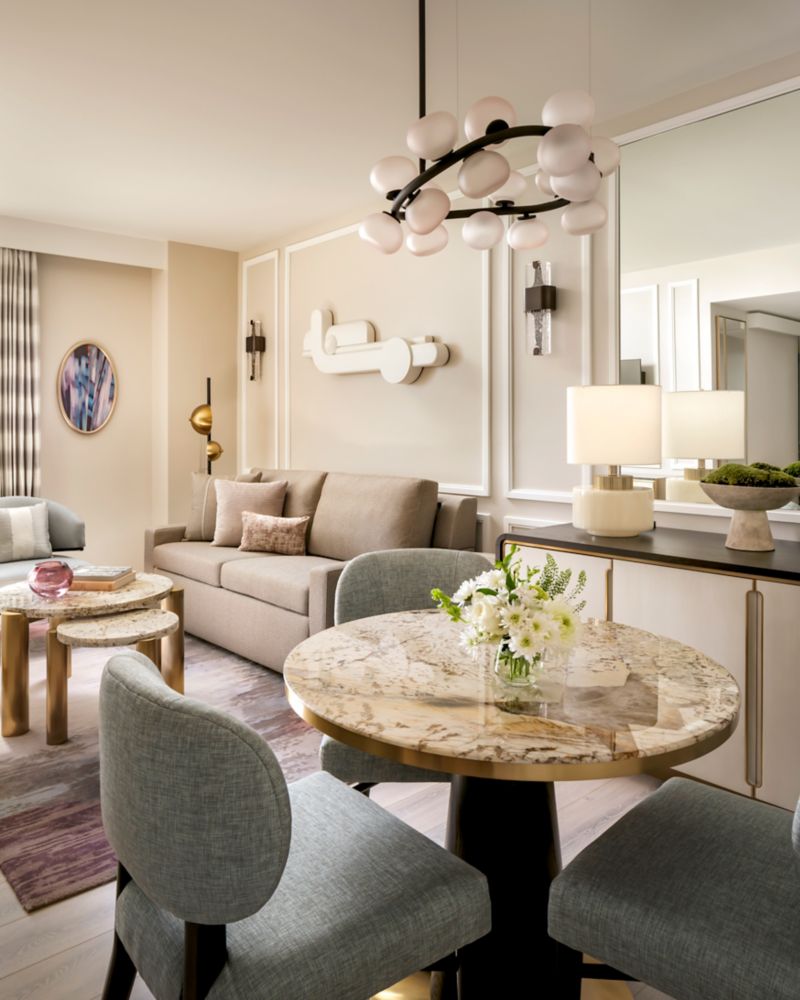 Offering comfort and space, these suites have a separate living room with designated dining area, marble bathroom with shower and soaking tub and private bedroom with windows to the south and east.