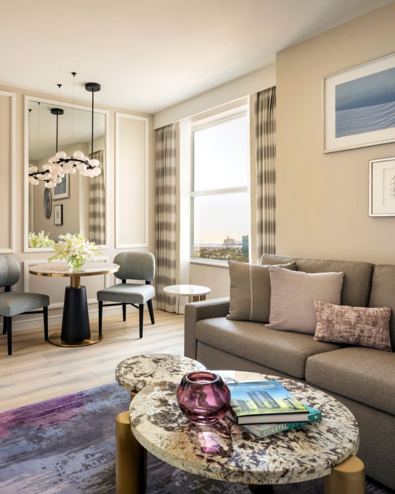 Indulge in true Breakers style in our premier suite on our highest floor with windows to the south and east overlooking the Bay and Pacific Ocean. Central living and dining room separates the bedrooms.