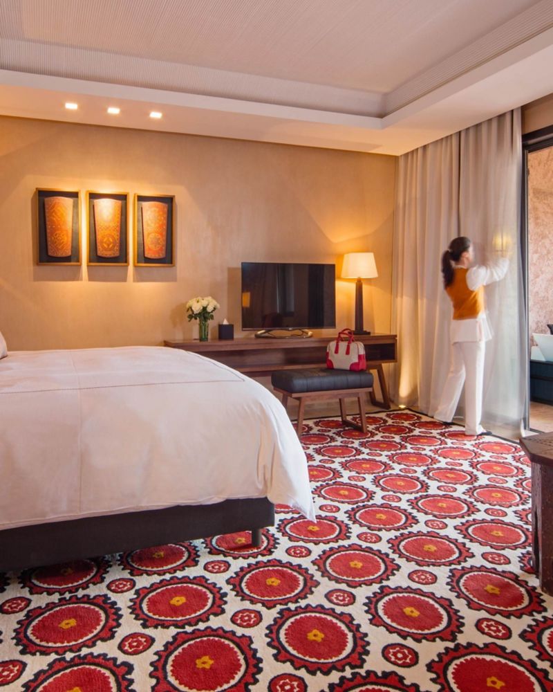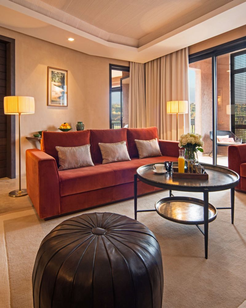 This 126 sqm suite exudes space, comfort, and elegance. The bedroom features creamy shades, while the deep-red lounge opens to a terrace with views of the golf course and Atlas Mountains. Modern elements blend with Moroccan accents throughout. The spacious bathroom highlights exquisite Moroccan craftsmanship and luxury.