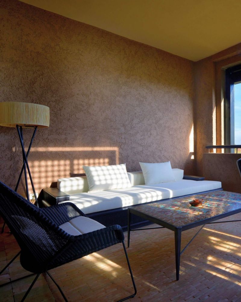Separate bedroom and living room. Painted in a bold deep-red color, the lounge area connects onto the gardens through a large terrace . Both spacious and functional, the beautiful bathroom is a shrine to Moroccan craftsmanship .