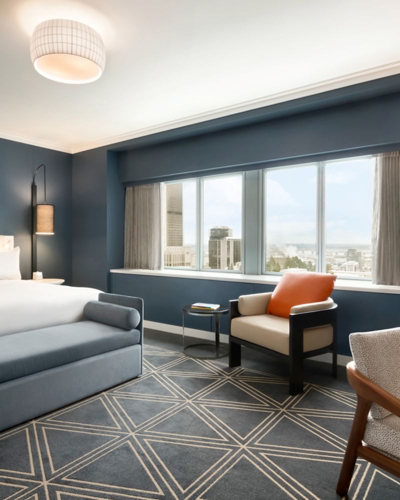 Gold lounge access includes deluxe continental breakfast and cocktail hour hors doeuvres, City skyline views, Chromecast technology, Bathroom with bathtub, Located on floors 18-19