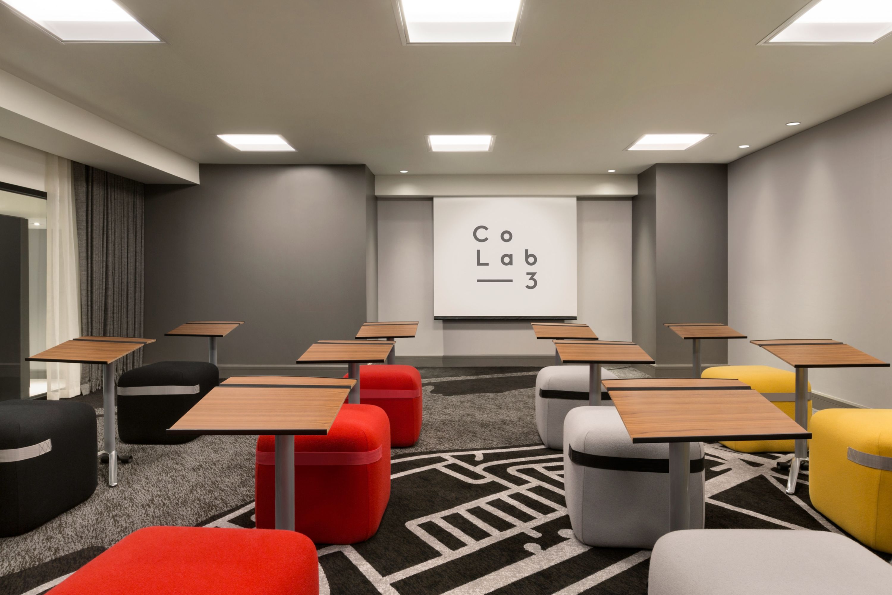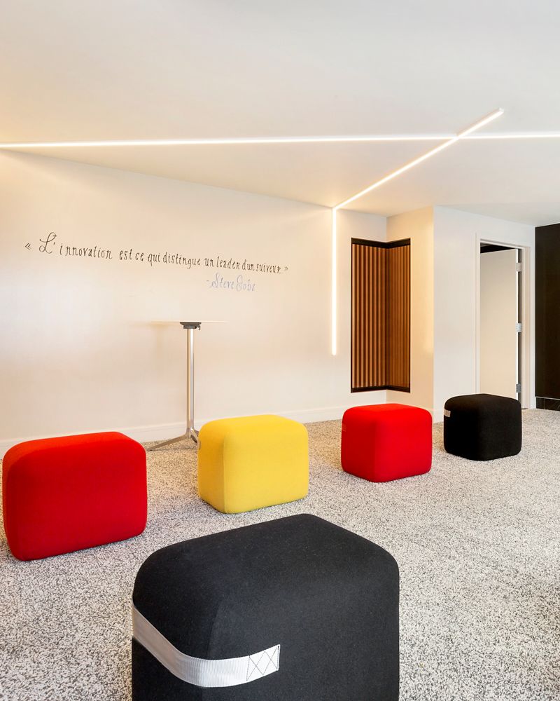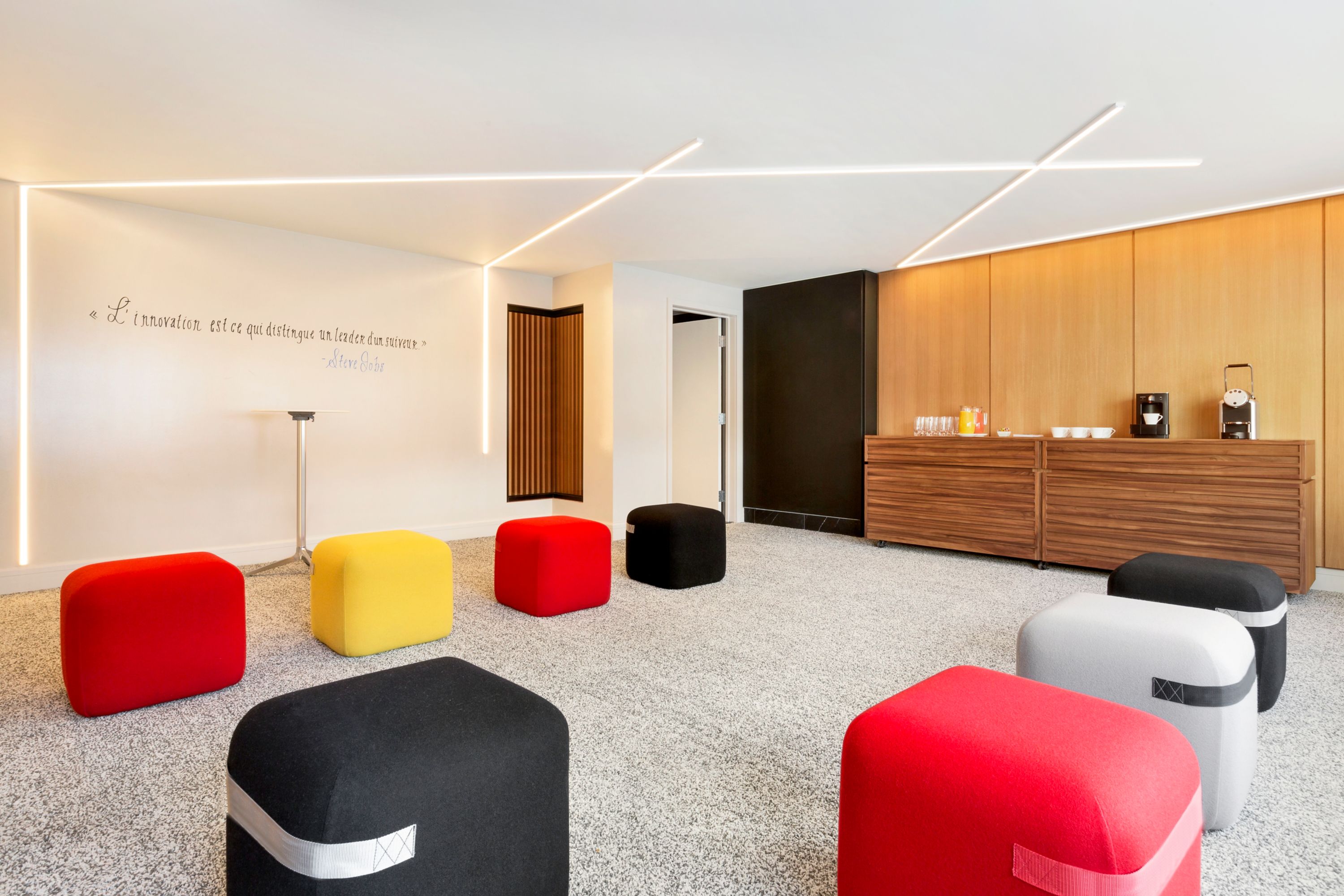 Coller is a twin room to Copier. They each accommodate up to 15 guests. Both feature dry-erase walls, a wall of stick-on sheets, colourful poufs, and abundant natural light—perfect for brainstorming sessions and dynamic meetings.