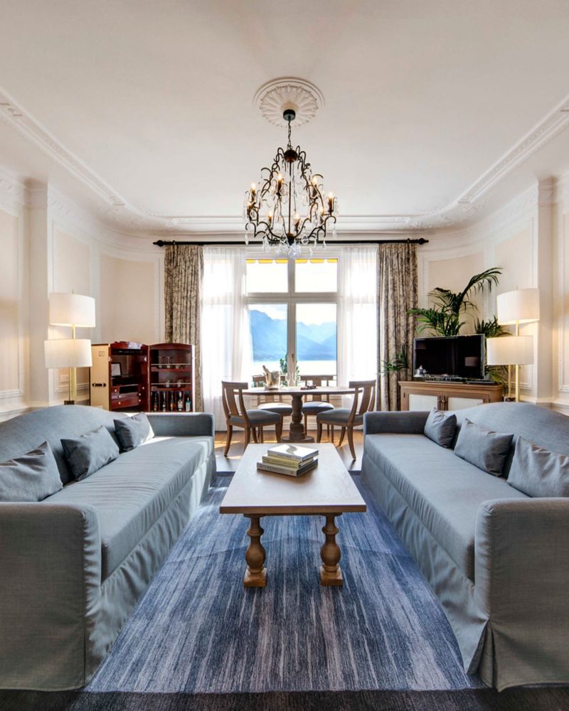 Traditional suite with separate living room in a luxurious decor. Features a spacious marble bathroom, a large terrace overlooking Lake Leman and the Alps, and in-suite iPad directory.