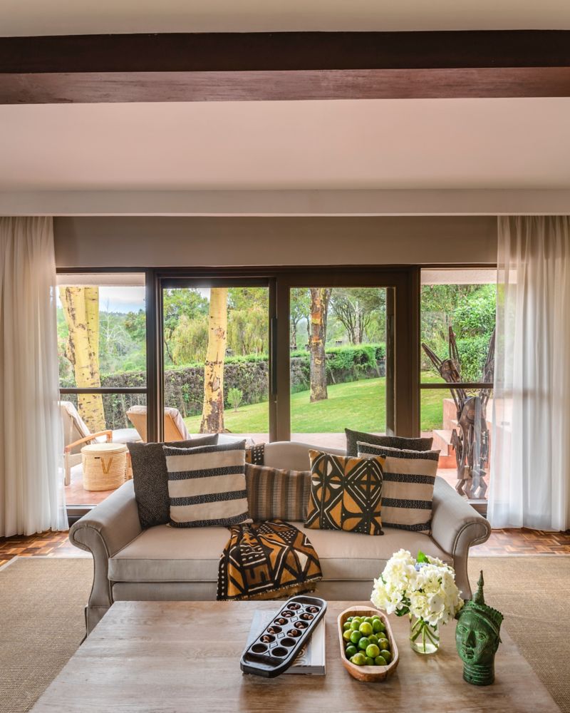 A spacious and elegant suite featuring a living area with sofa and a cosy fireplace with great views of the magnificent Mount Kenya or the expansive garden.