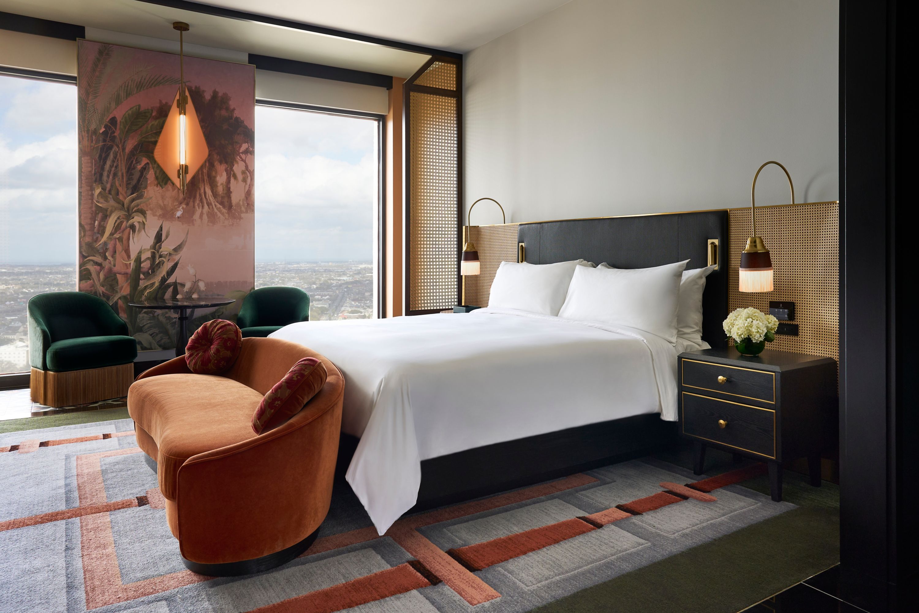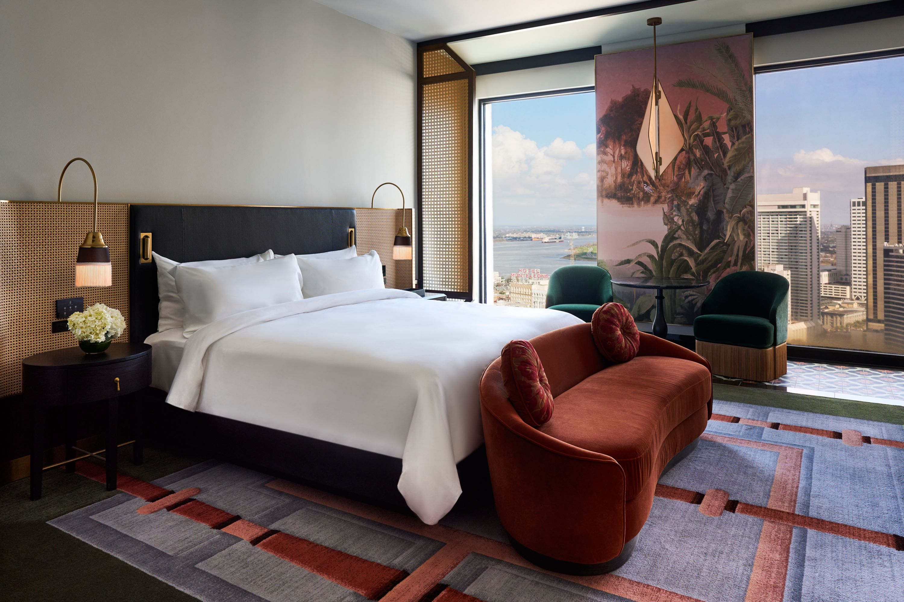 Wake up to views of New Orleans in this stylish guestroom. Inviting sitting area and marble entry. Bathroom with dual vanity, makeup table, and rain shower with adjustable arm, plus Nespresso, tea kettle, and minibar.