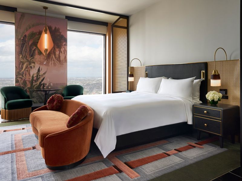 A thoughtfully designed guestroom with city views. Bright sitting area and marble entry. Bathroom with dual vanity, plus Nespresso, tea kettle, minibar. Mobility and hearing accessible with roll-in shower and lower peephole.