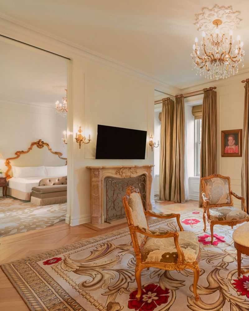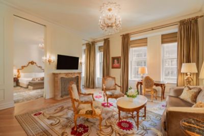 2-bedroom suite overlooks 5th Ave. Large living room, dining area, 2 full bathrooms, claw foot bath tub, and separate shower. Includes butler service.
