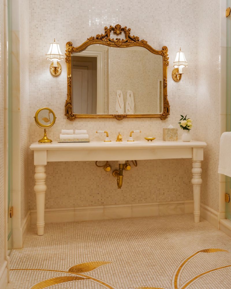 High ceilings with comfortable sitting area and courtyard or city view. Includes spacious bathroom adorned with mosaic tiles and gold fixtures, with bathtub and separate shower.