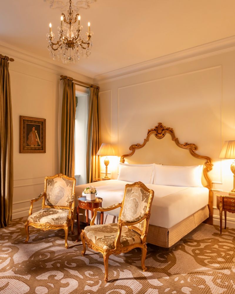The Grand Luxe King Room features an open-concept room that provides a comfortable sitting area, King Bed, and Butler's pantry. The bathroom reflects The Plaza's classically elegant style with inlaid "earth stone" mosaics, a luxurious bathtub, and a separate, oversize shower. Details include 24-carat gold-plated Sherle Wagner fixtures, as well as solid white marble vanities and wet bar.