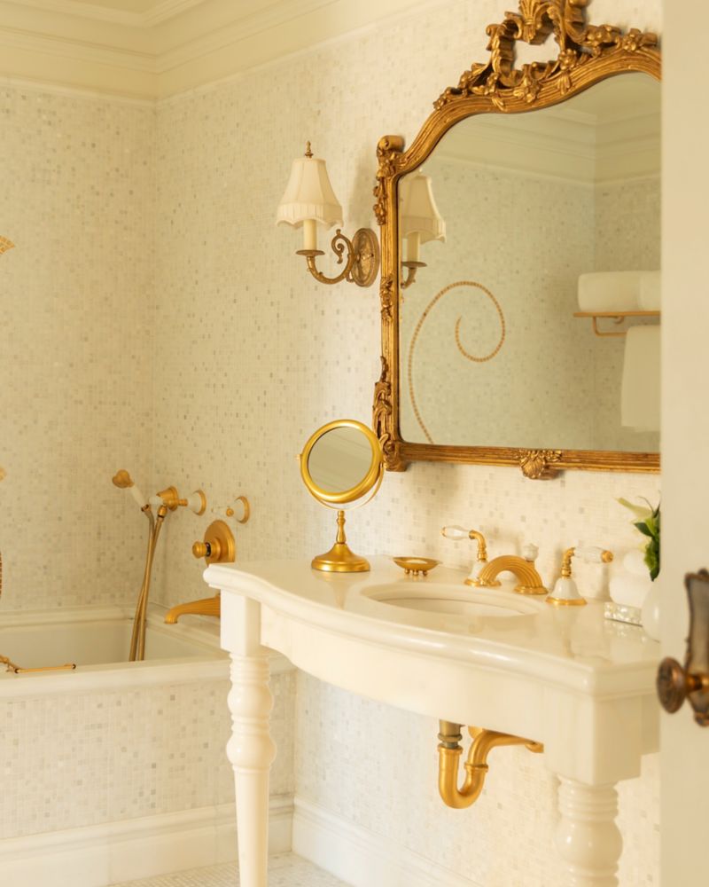 High ceilings with comfortable sitting area and courtyard or city view. Includes spacious bathroom adorned with mosaic tiles and gold fixtures, with bathtub and separate shower.