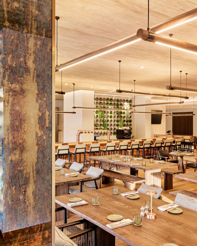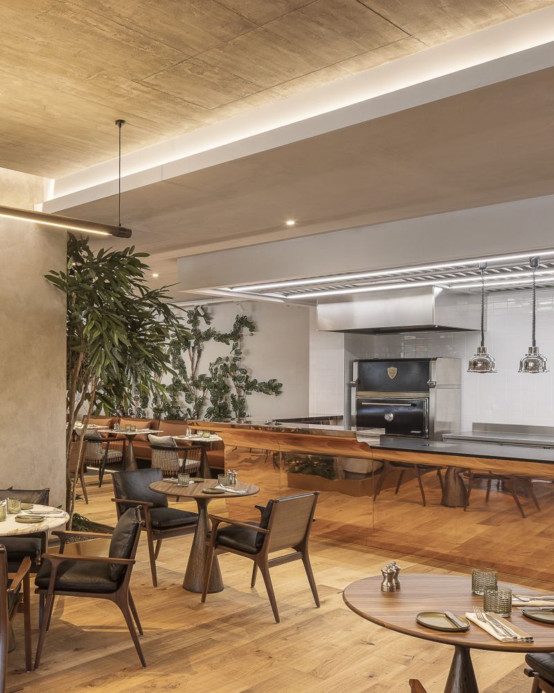 Inside, the nature-inspired design blends organic materials with sleek accents of metal and concrete, creating a modern yet inviting atmosphere that perfectly complements the riverside setting.