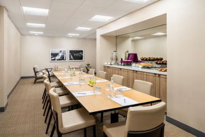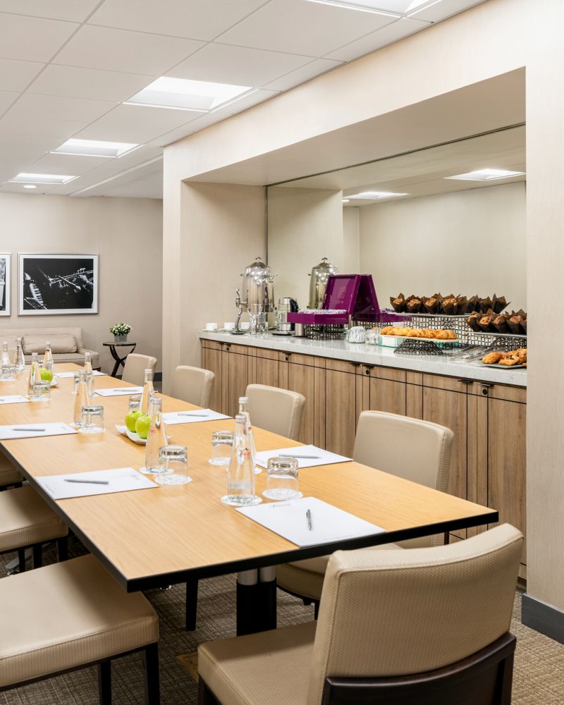 The 352 sq. ft. Moreno Boardroom accommodates up to 24 guests and features a rectangular table and a comfortable sofa, offering a casual and relaxed space for productive meetings.