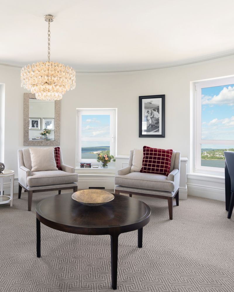 Premium suite, Queen Elizabeth II-inspired decor, luxurious sleep experience, marble bathtubroom, spacious living room, views of St. Lawrence River.