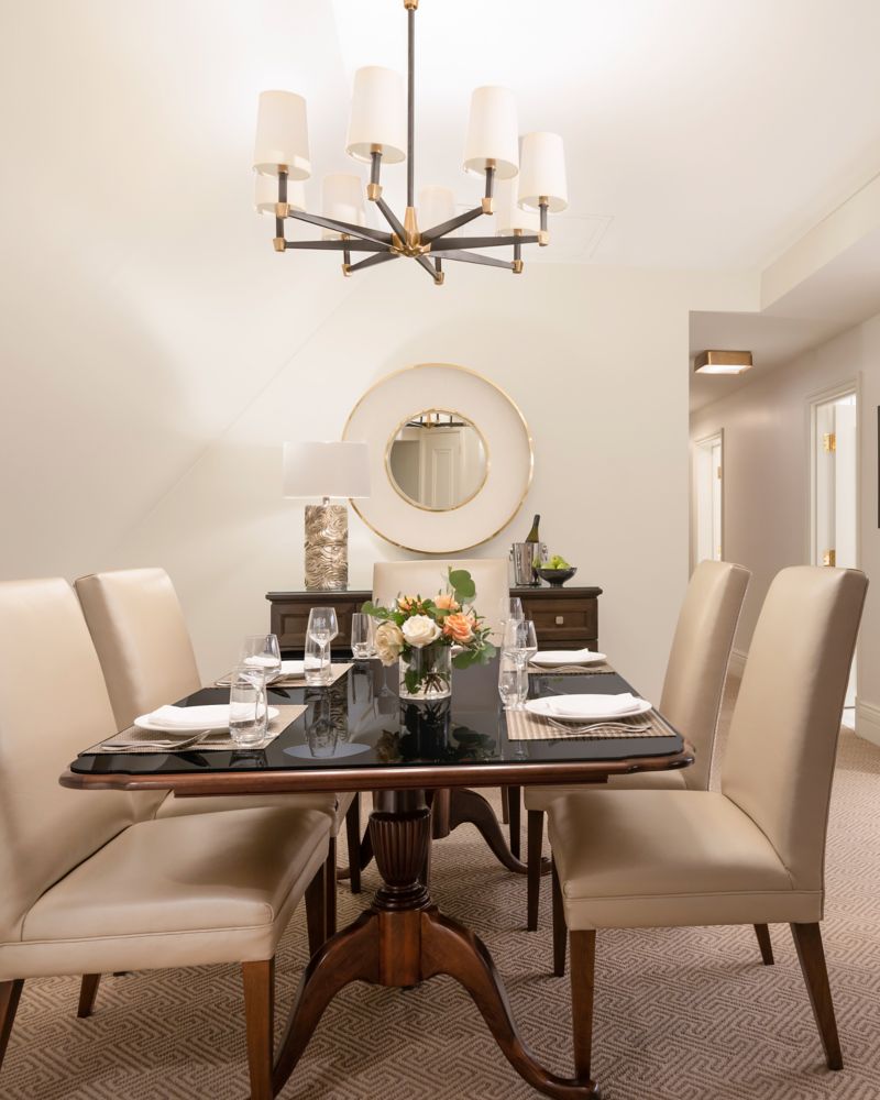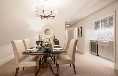 Premium suite on the top floor with private access. Roosevelt-inspired decor, large bedroom, living room and dining room. Luxurious marble shower, Views of Old Quebec. Includes butler service.
