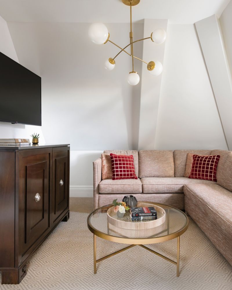 Premium Suite, Hitchcock-inspired decor, luxurious sleep experience, freestanding bathtubtub and shower, spacious living room with sofabed, view of St. Lawrence River.