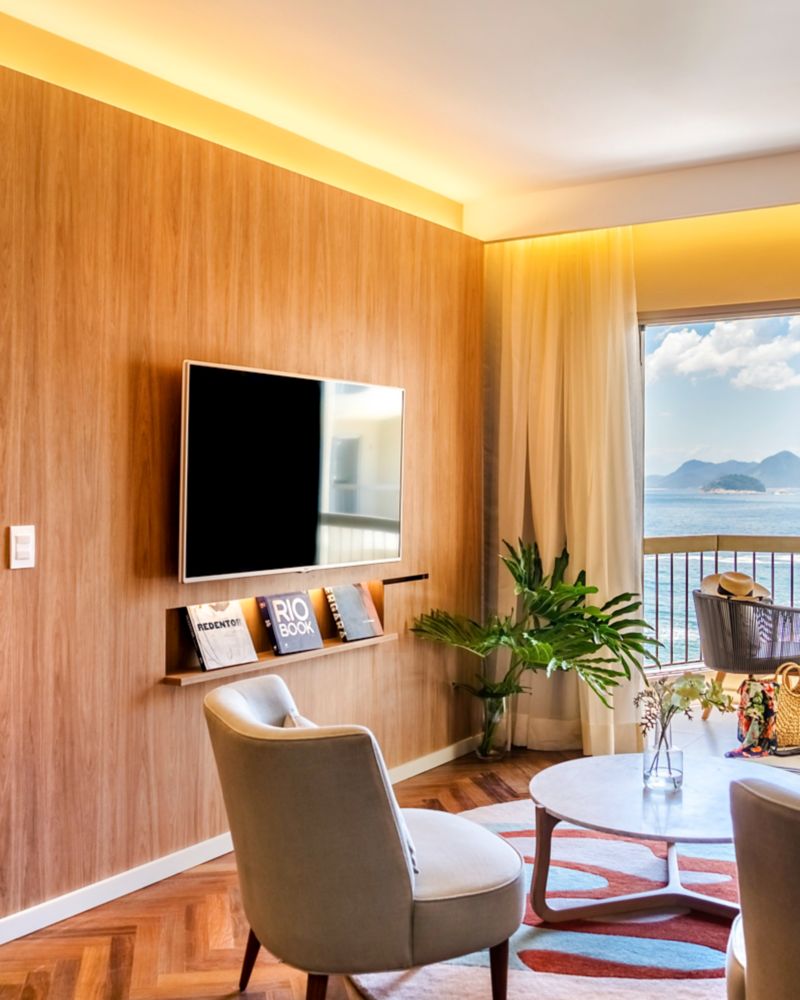 Sophisticated Junior Gold suite with integrated living room and bedroom, artwork, view of Copacabana beach, access to the executive lounge, buffet breakfast, happy hour, Gold Solarium and 24-hour butler.