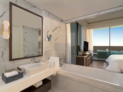 Located on the highest floors, the 718 sqm Royal Penthouse features lavish interiors, 4 master bedrooms, a sumptuous living area, a home theater, 5 bathrooms, luxury office, fully equipped kitchen and maid room. It includes a Jacuzzi and private gym.