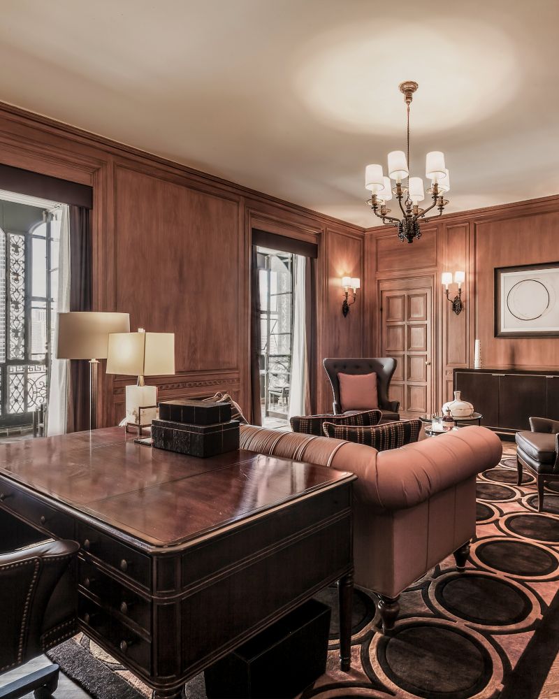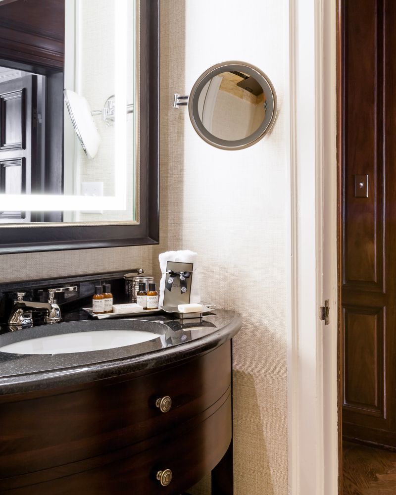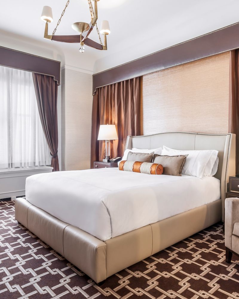 This stately suite is located on the 5th floor of the historic main building. Featuring a dry bar, built-in bookcases and regal decorative fireplace, this suite is truly unique. It's glass-enclosed balcony offers breathtaking panoramic views of the City skyline and rooftop garden. Featuring a king bed, the suite can be connected to another room.