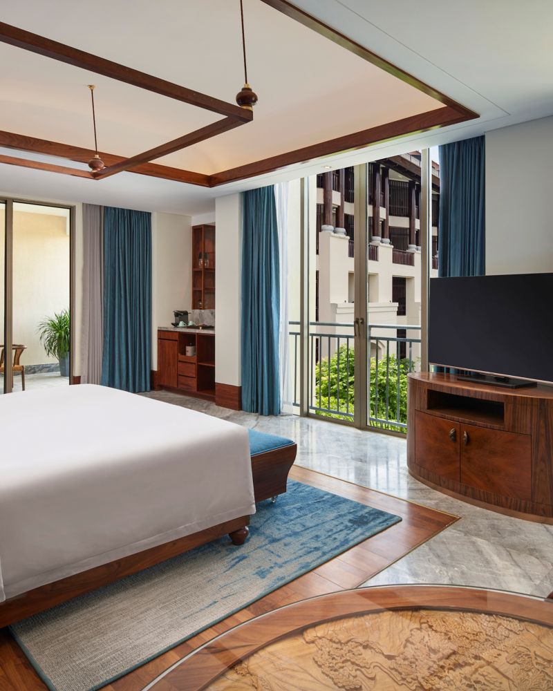 65 sqm room on Levels 3 to 5, with rainshower and bathtub, minibar, private safe, traditional Chinese woodcarving, 55" LCD TV, free WIFI, floor to ceiling windows, and private balcony. (Extra bed available upon request.)