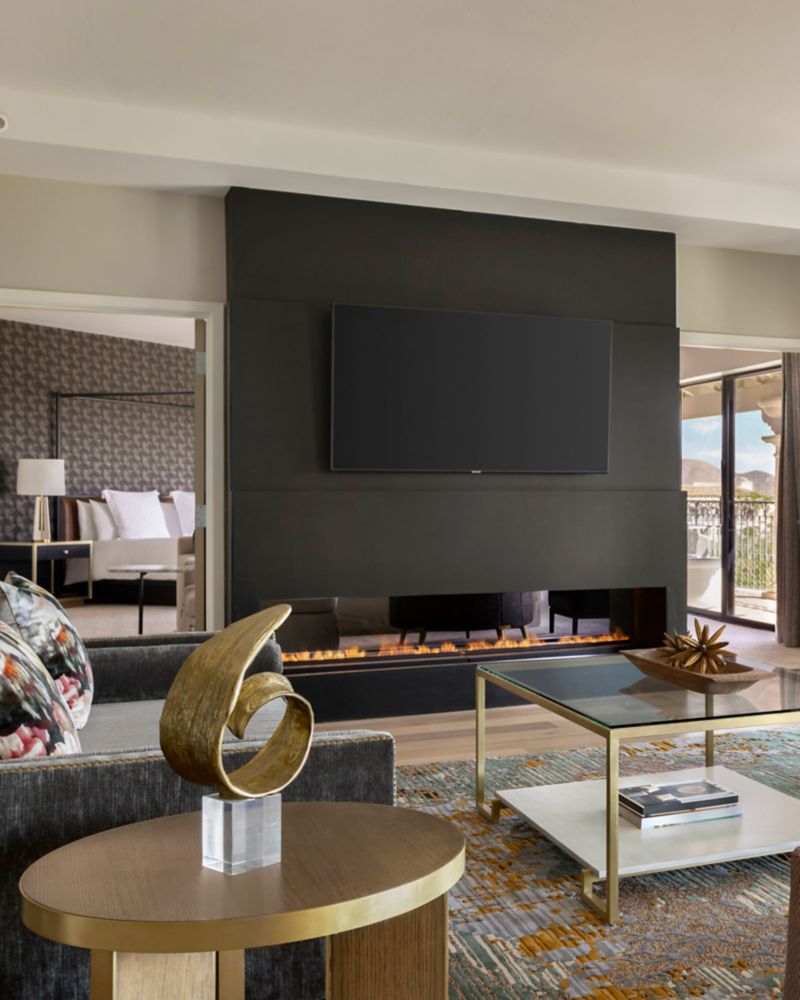 These guest rooms feature an open living and bedroom area with expansive desert views just beyond the glass doors. Dual vanities and an oversized shower give you plenty of space to get ready for an evening at one of our award-winning restaurants. Work, relax and watch TV, or sink into the comfortable bed for a peaceful night's rest.