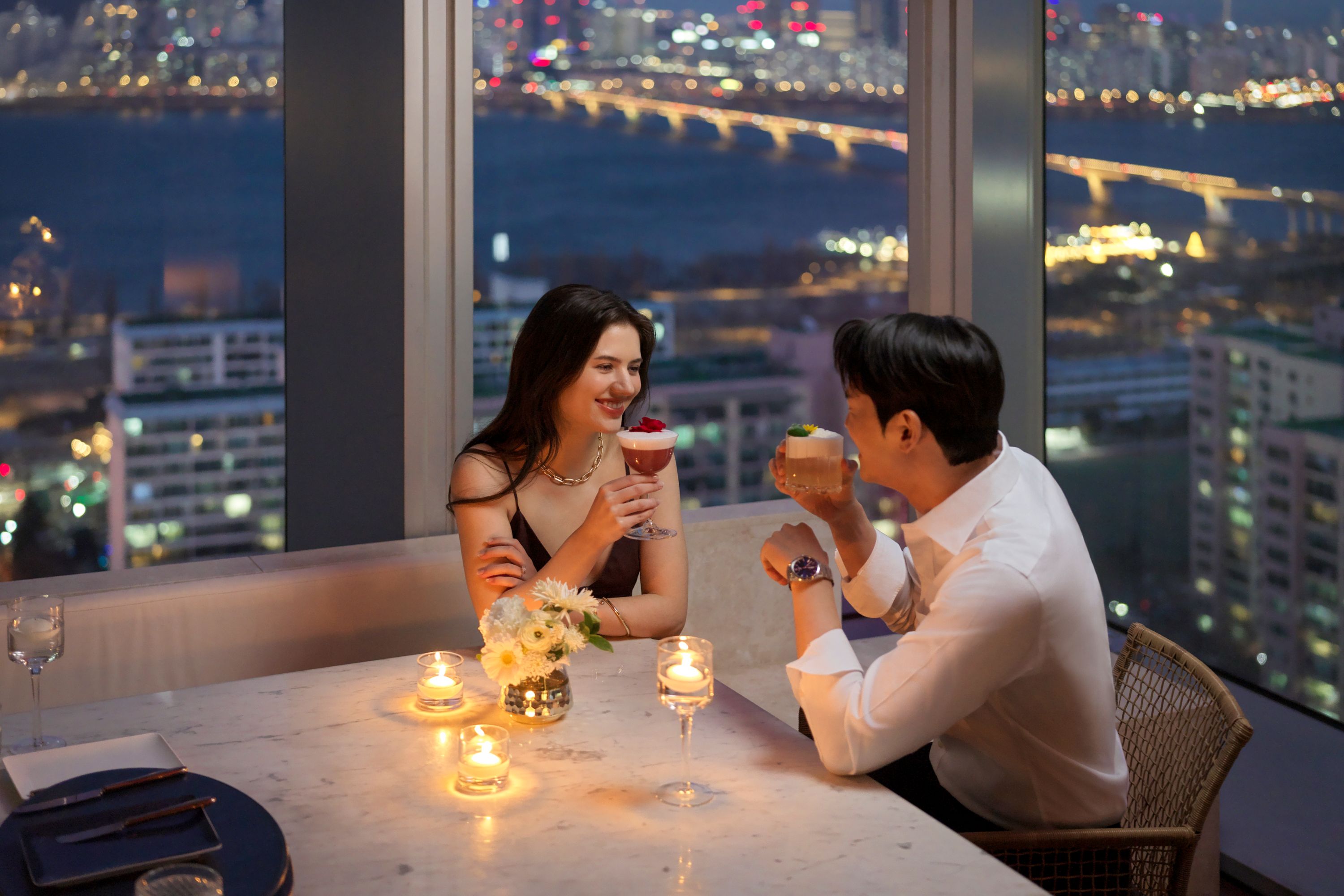 A cinematic proposal in a private dining room with a six-course fine dining journey, hanbok-inspired florals, K-Drama serenade, champagne, personalized cake, and keepsakes to celebrate your love.