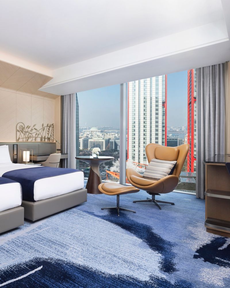 Enjoy the flexibility of a king bed composed of two single beds placed together, amid modern interior design complemented by an exquisite marble bathroom. ※ The room images may differ from the actual assigned view.