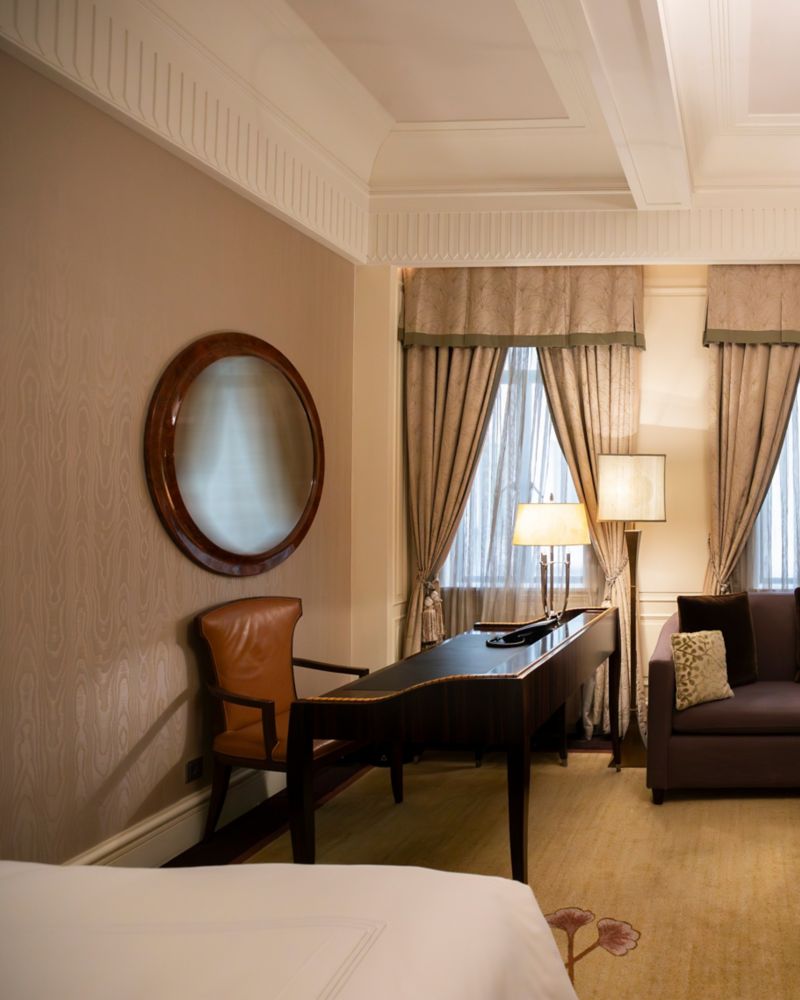 Room 619, the French Suite presents an Art Nouveau style with classically figured wall paper, walnut carved furniture and luxuriously designed fabrics. The suite offers a living room, dining room, bedroom and bathroom.