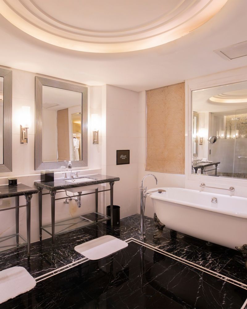 Fairmont Rooms are Art-Deco inspired interior featuring high ceilings, stately furnishings in a spacious layout. Eleqant marble bathrooms with claw-footed bathtub and his / hers washing basins, state-of-the-art in-room technology, thoughtful amenities and rainforest experience showers, come together to create an atmosphere of understated elegance.