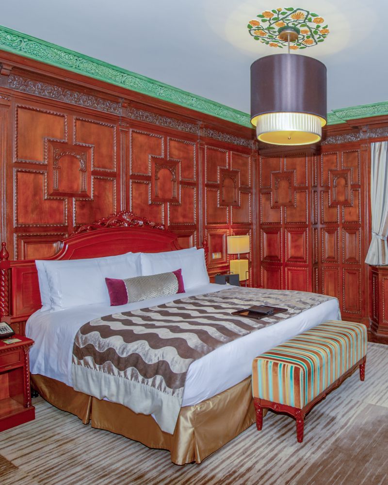 Room 520, there is filigree plaster work on the walls, ceilings from which hang extravagant pendant lights and rich Indian carpets on the floor. The suite has a living room, dining room, bedroom and bathroom.