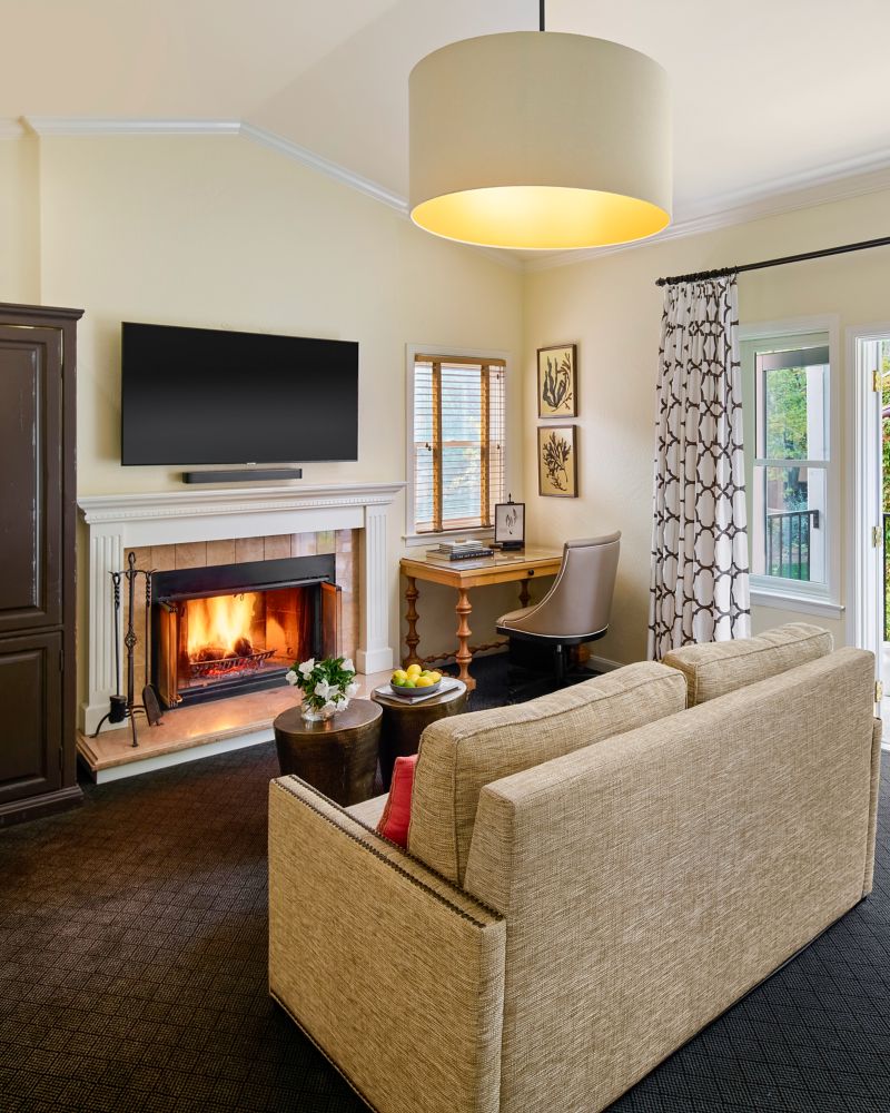 Spacious suite featuring charming wood-burning fireplace, sitting area with sofabed, and private patio. Some of these rooms are fully compliant with the Americans with Disabilities Act (ADA), featuring bathtub and toilet grab bars.