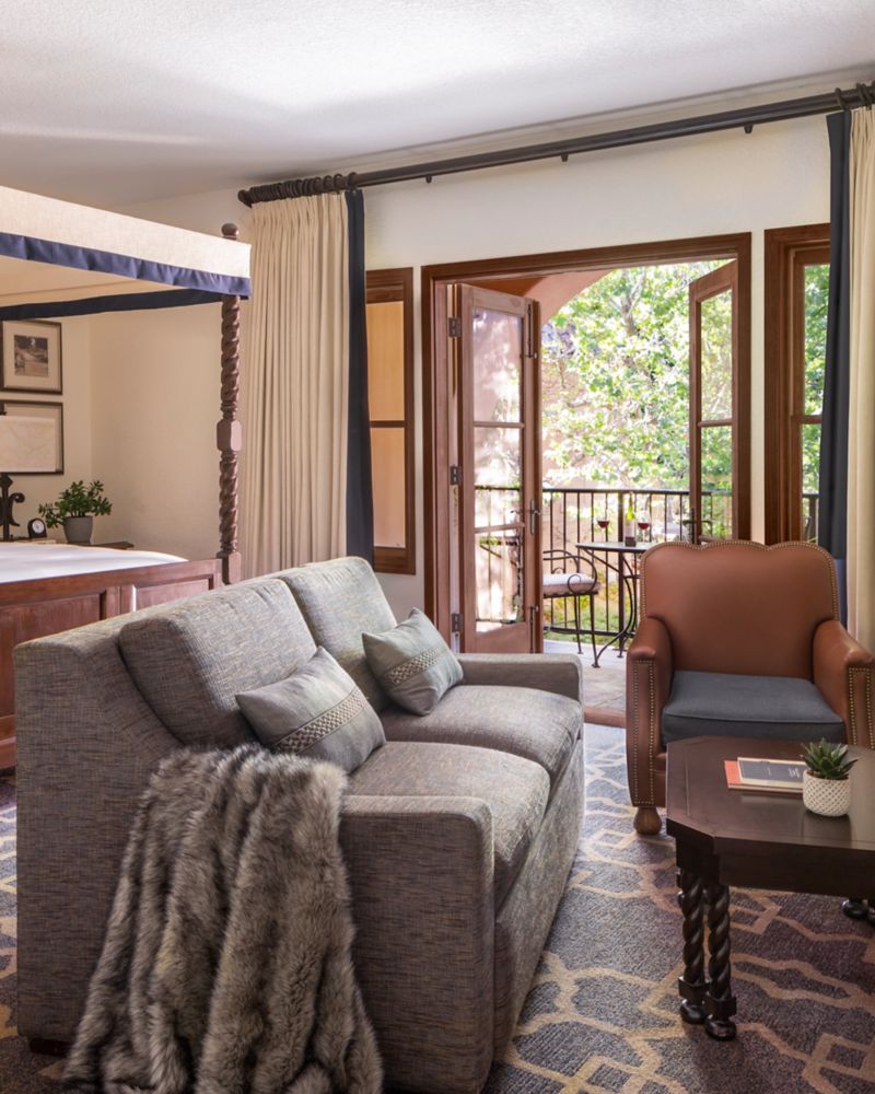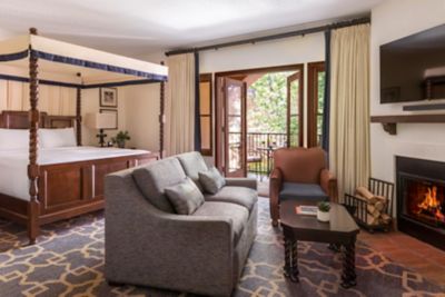 Spacious suite featuring charming wood-burning fireplace, sitting area with sofabed, and private patio. Some of these rooms are fully compliant with the Americans with Disabilities Act (ADA), featuring bathtub and toilet grab bars.