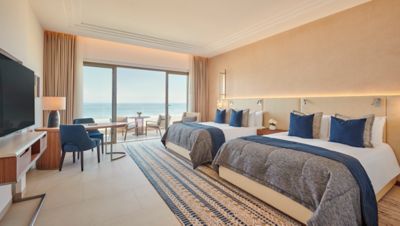 Deluxe two queen size beds Ocean view room with contemporary room design and a touch of Berber heritage, Oversized marble bathroom, large private balcony, Complimentary WIFI, Breakfast is included for up to two adults.