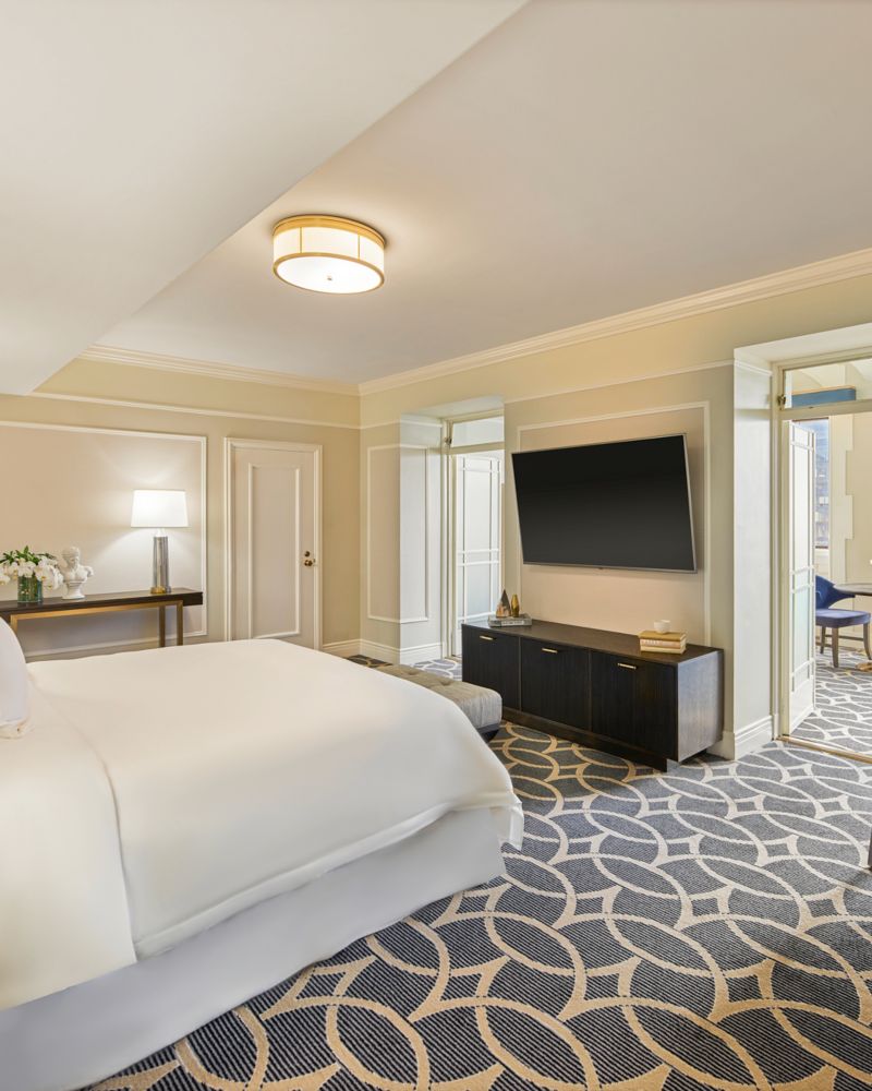 Newly renovated suite with a separate bedroom, elegant glass French doors, and a living room with a pull-out sofa bed. Fairmont Gold guests enjoy complimentary breakfast, evening capapes, private check-in and personalized concierge services.