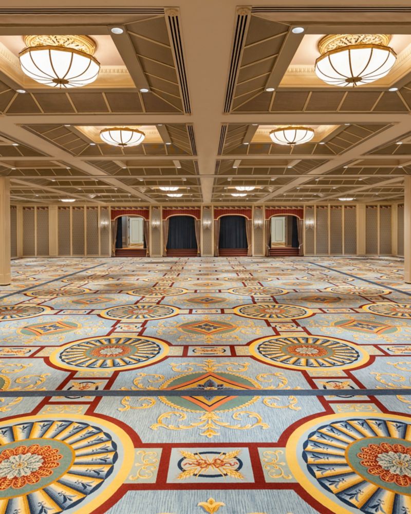 The BC Ballroom is 11,400 sq. ft. with a 14' 4" ceiling, and its own 5,500 sq. ft. foyer. The ballroom can be divided into two equal sections with double air walls for sound reduction. The British Columbia Ballroom has large chandeliers recessed into ceiling coves, complemented by blue and gold hand-finished carpet and decorative walls trimmed with moldings.