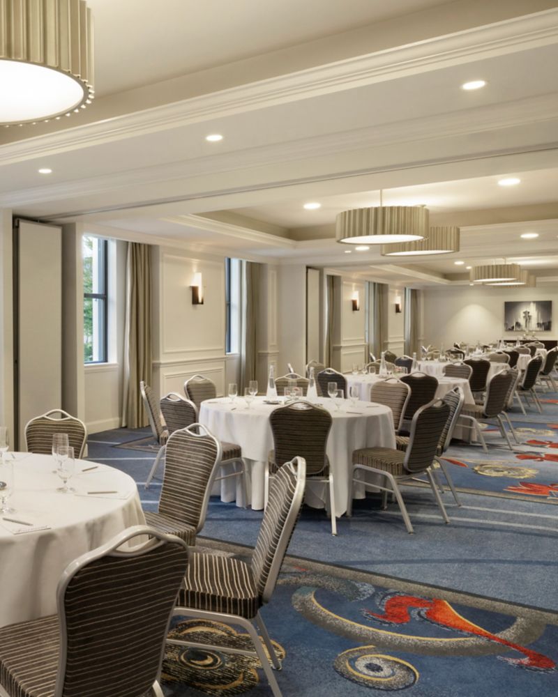 The Saltspring Island Room is 1,953 sq. ft. and features two airwalls for optional division, offering six different configurations. The room provides natural light from windows that overlook the historic Vancouver Art Gallery.