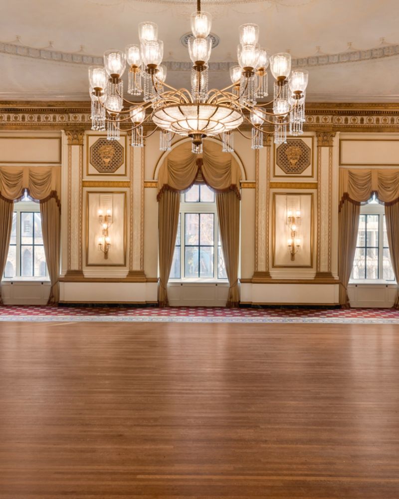 The Vancouver Island Room is 2,500 sq. ft. with a 16 ft. ceiling carved and gilded ceiling. The perfect complement to the Pacific Ballroom featuring crystal chandeliers and matching marble fireplaces at each end of the room. This is a rectangular room with beveled corners giving the room an oval feel. Four sets of generous French doors, inset with mirrors, line the length of the room and provide access to the Pacific Ballroom adjoining foyer, or to the British Columbia Ballroom.