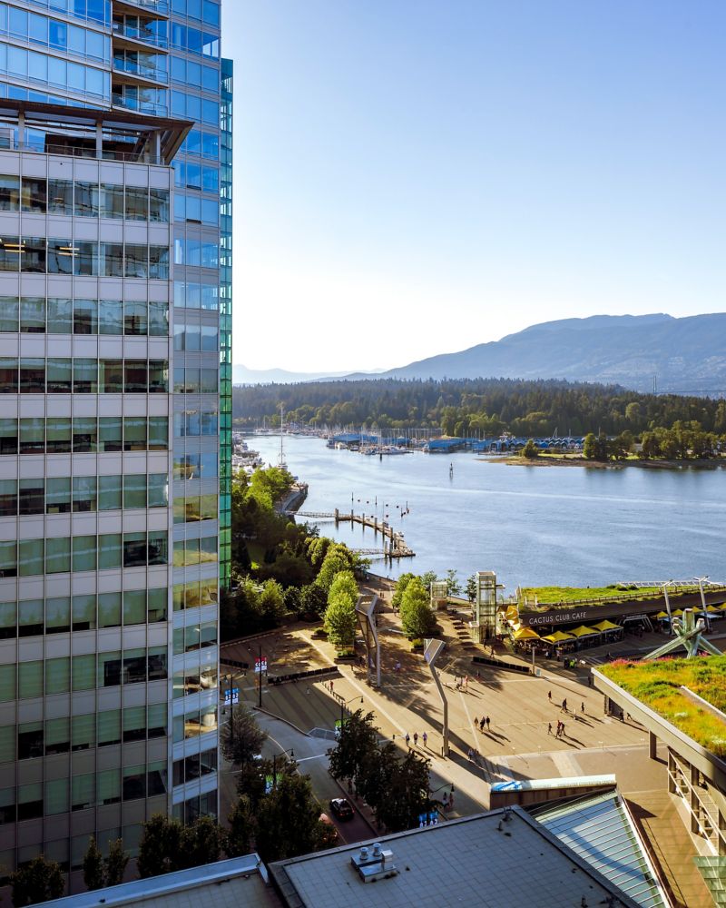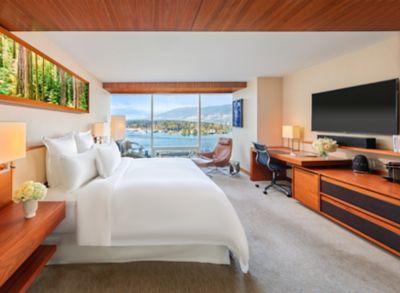 The one-of-a-kind Coal Harbour Corner Suites feature a private balcony showcasing views of the bustling port of Coal Harbour and Stanley Park. Elegantly appointed with modern decor, separate living and dining area and oversized marble spa bathrooms.