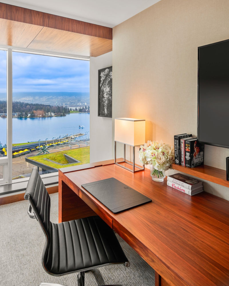 The Signature Harbour View Suite offers Vancouver's most stunning harbour and mountain views. Elements of fashion, art and music are incorporated in the living room, two marble bathrooms, bedroom with a king size canopy bed and large walk-in closet.