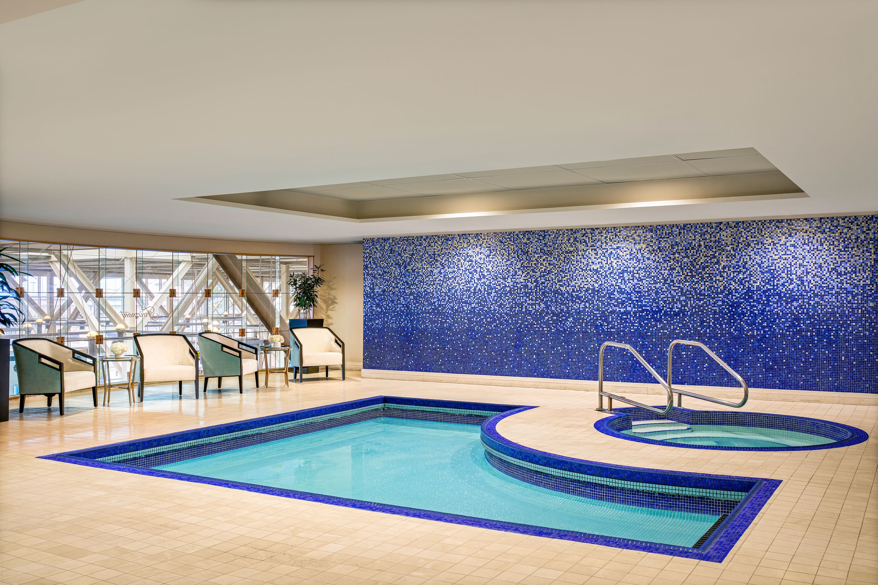 Registered guests enjoy complimentary access to the Health Club, overlooking the U.S. Departures terminal. Facilities include a Fitness Centre with a lululemon Studio Mirror, Peloton bike, elliptical trainers, free weights, multi-gym, rowing machine, stair climbers, stationary bikes, and treadmills. The Club also features an indoor pool, whirlpool, children’s wading pool, and separate men’s and women’s dry saunas.