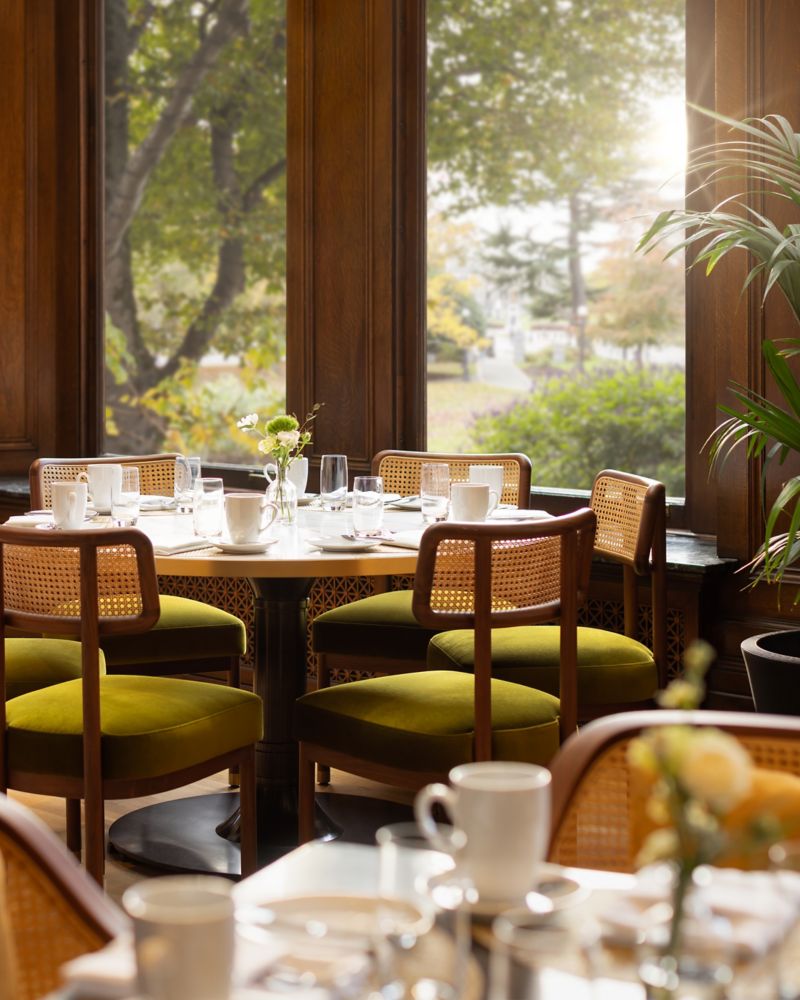 Combining classic charm with a contemporary touch, the restaurant features light-filled interiors that bring the outside garden in. Original beams celebrate the room’s history, while soft velvet seating and elegant finishes create a welcoming, modern atmosphere. Subtle textures and thoughtful details complete a space where tradition and comfort meet effortlessly.