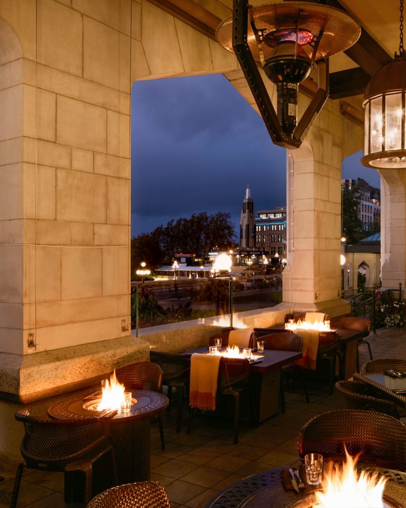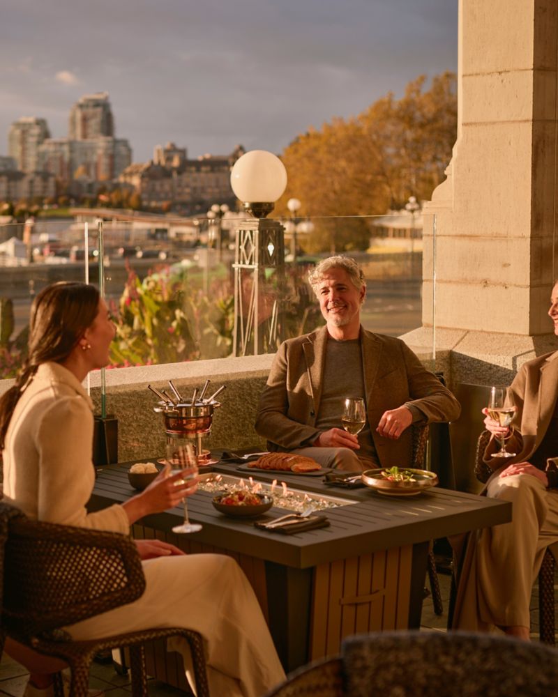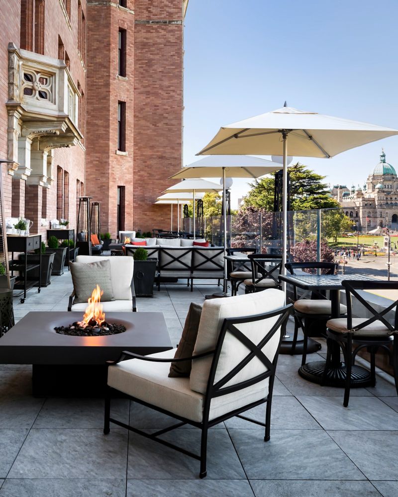 The Veranda at the Empress offers a stunning outdoor dining experience with panoramic views of Victoria’s Inner Harbour. Guests can enjoy cocktails or casual meals while soaking in the scenic beauty and historic charm of the Fairmont Empress Hotel's surroundings.