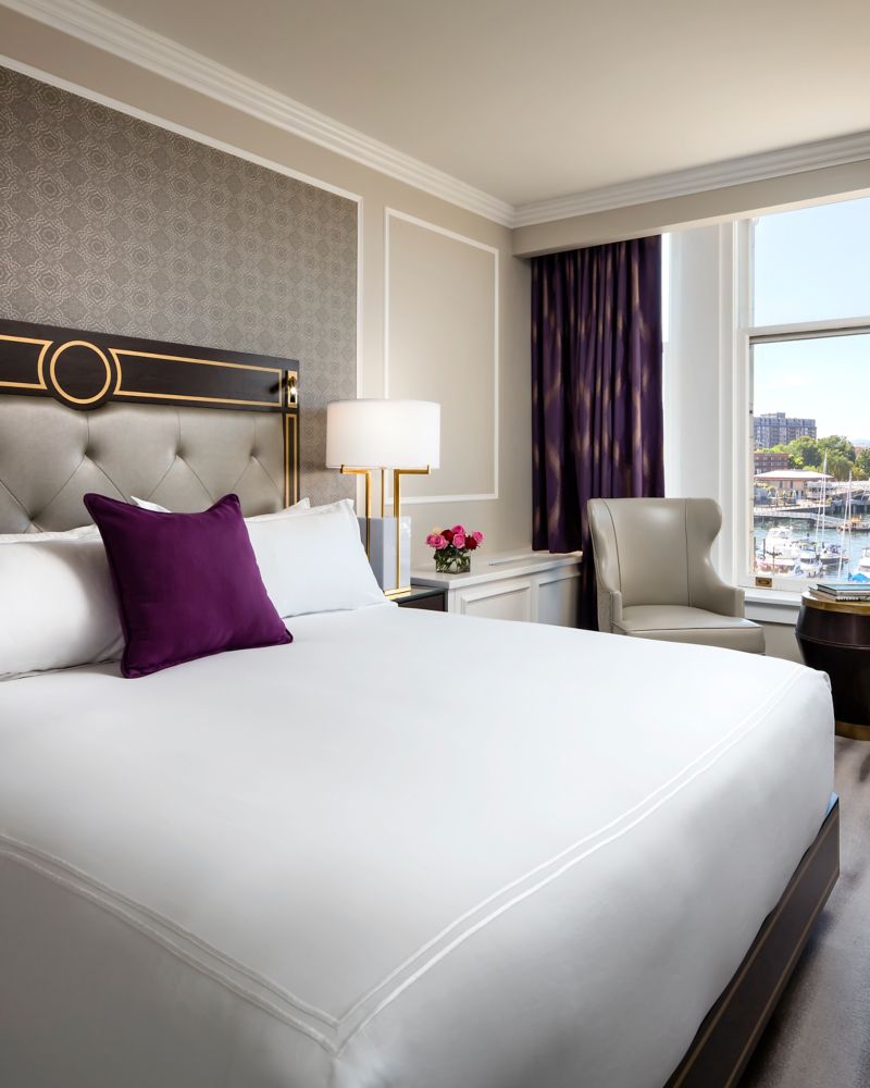 Spectacular harbour view. Airy and inviting, this queen room design brings the outside in. These well-appointed rooms have a classic-meets-contemporary design inspired by Vancouver Island nature